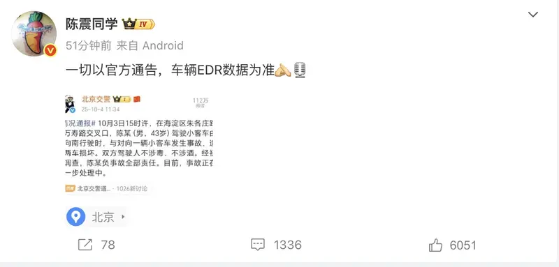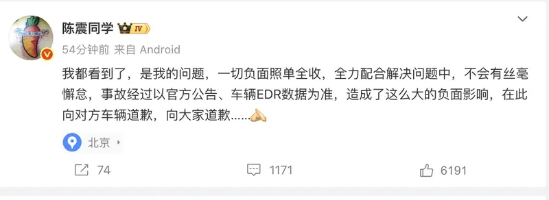 北京交警发布通报后不久,陈震在个人微博上进行了转发,表示一切以官方通告,车辆EDR数据为准。不久后陈震再次发布微博表示,我都看到了,是我的问题,一切负面照单全收,全力配合解决问题中,不会有丝毫懈怠,事故经过以官方公告、车辆EDR数据为准,造成了这么大的负面影响,在此向对方车辆道歉,向大家道歉。