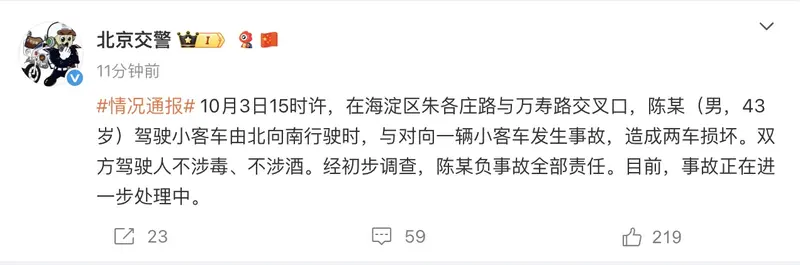 易车讯 10月4日,北京交警就陈震“劳斯莱斯车祸”事件发布通报。10月3日15时许,在海淀区朱各庄路与万寿路交叉口,陈某(男,43岁)驾驶小客车由北向南行驶时,与对向一辆小客车发生事故,造成两车损坏。双方驾驶人不涉酒/毒驾。经初步调查,陈某负事故全部责任。目前,事故正在进一步处理中。