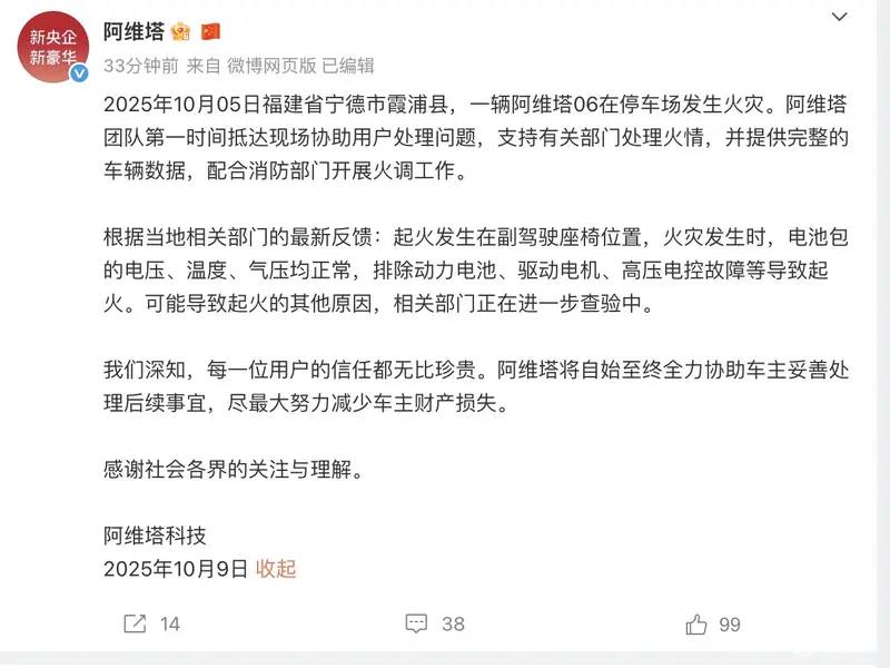 我们深知,每一位用户的信任都无比珍贵。阿维塔将自始至终全力协助车主妥善处理后续事宜,尽最大努力减少车主财产损失。感谢社会各界的关注与理解。
