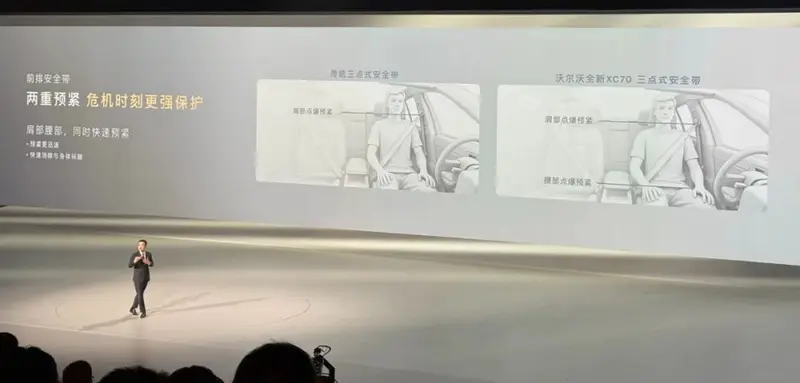 再比如,安全带这块沃尔沃又“偷摸”升级了:传统三点式只有肩部点爆预紧,这次XC70的安全带新加入了腰部点爆预紧,同时还做了两级限力,益处就是,勒的速度更快了面积更全了,但力度却更柔和了。
