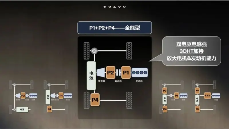 而沃尔沃选择了行业里最复杂的“P1+P2+P4三电机”架构,用通俗点的话讲,如果说市面上常见的P1+P3是简装房,那么沃尔沃的这套插混堪称豪宅。
