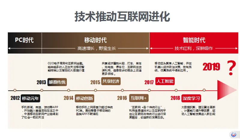 从上图中可以看到,2012年移动互联网时代到来;2017年已经进入人工智能时代;到2018年,通过大数据积聚、理论算法革新、计算能力提升等因素,人工智能发展业已进入深度学习的新阶段。在互联网技术快速变化的背景下,如何与用户进行深度的互动,进而实现更高效的转化?我认为,这需要通过技术来推进改变。