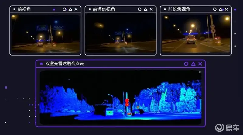 再说回两颗够不够的问题,双激光雷达的点云视场更广、更安全,相比单雷达设计的120度FOV,车头双雷达可实现水平180度的FOV覆盖,在“鬼探头”、左右有遮挡物等行车场景中,对左右横穿行人或障碍物的识别能力更强。其次,是对车辆重点区域的识别更精准,在车辆正前方60度FOV的区域内,双激光雷达可做到加倍重叠,目标物上的点云数据更多,识别准确率更高。第三,在高阶自动驾驶的冗余安全方面,双激光雷达可互为安全冗余,比单激光雷达方案的可靠性更强。