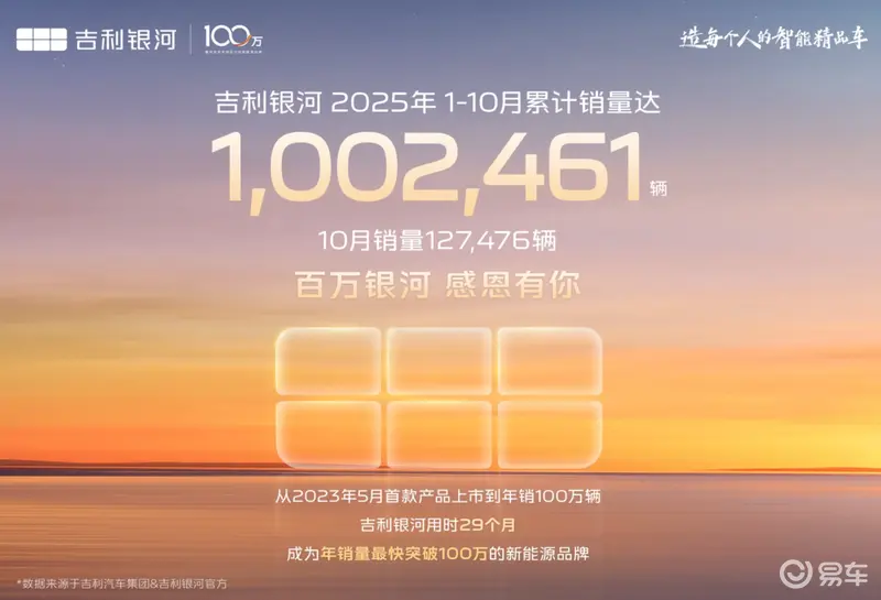 今年1-10月新能源累计销量超134.5万辆,同比劲增106%。其中,吉利银河品牌10月销量达127476辆,同比增长101%,环比增长5%,创历史新高,今年前10个月累销100.2万辆,同比增长187%,已提前达成年销百万目标,成为最快达成年销百万的新能源汽车品牌,彰显“银河速度”。