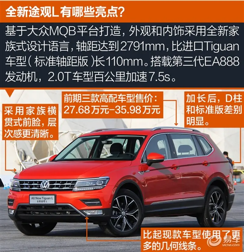 途观L比起标准轴距版的进口Tiguan轴距加长110mm,整体外观基本延续了进口Tiguan的设计,造型更加硬朗,加长后D柱设计差别较大,全车看起来更加扁平。销售方面,前期先发售高配车型,2017年1月18日新车上市发布会上将公布另外4款(3款330TSI和1款380TSI)车型的售价,新车前期共推出7款车型,不提供1.4T排量车型(进口Tiguan低配车型使用了1.4T发动机)。另外,新车上市后现款途观1.8T及2.0T排量车型将停产,但将保留1.4T丝绸之路版车型与全新途观L同堂销售。