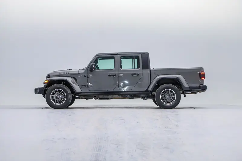 车身侧面,可以看到角斗士与长轴版牧马人一张采用了双排四门的布局。外露的车门铰链和黑色的塑料车顶也都与牧马人一样具有拆卸功能,另外前挡风玻璃也可以放倒。车身尺寸长宽高为5537/1875/1857mm、轴距3487mm,比长轴版牧马人轴距长了479mm。它的接近角为40°、离去角为25°、通过角为18°、离地间隙为249mm,更长的轴距也让它的通过角要逊色于牧马人不少。