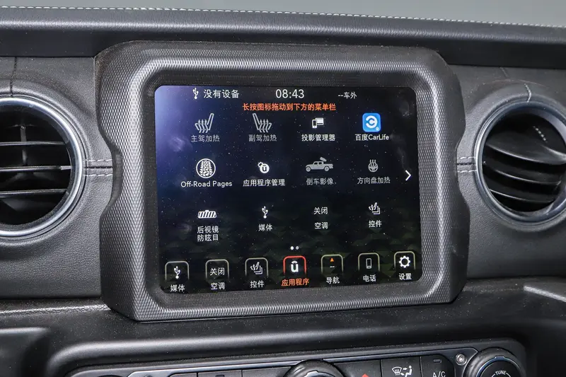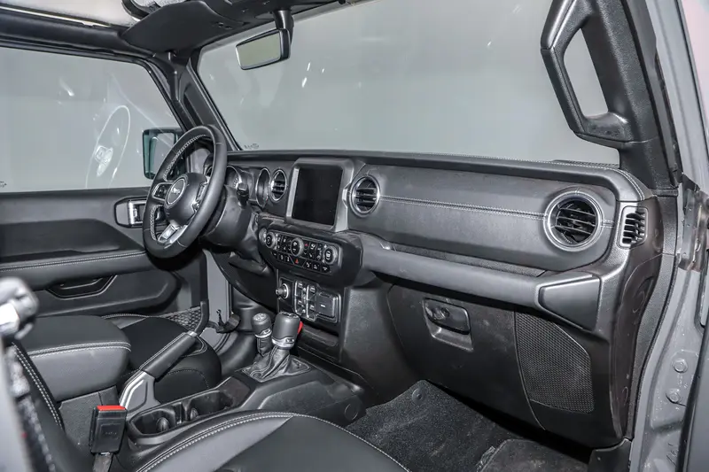 进入车内,角斗士的内饰与牧马人完全相同,棱角分明的中控台、大面积的实体按键都展现着粗狂的硬派越风格。不过这种粗狂的风格下,内饰还采用了一些皮革及缝线作为点缀,提升了些许精致感。