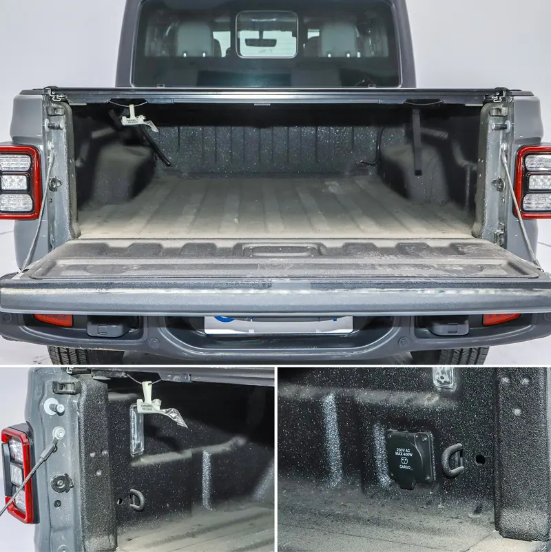 车尾部分,车斗内原厂就喷涂了防刮涂层,增强了表面的耐磨性,并配备了原厂三段式尾盖。车斗内长宽高为1531/1442/445mm,最大载重质量为568kg。车斗内部230V电源带400W逆变器、锚点、照明灯应有尽有,可以说考虑得非常全面。