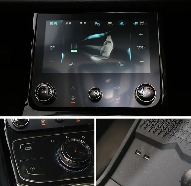 空调系统集成在了中控台底部的8英寸屏幕中,采用触控搭配实体按键的操作方式,科技感确实提升不小。旋钮式换挡区域则是经过了重新设计,视觉上更显精致,不过围绕换挡旋钮的驾驶模式、动能回收等控制键,使用上略显不便,轻触没有反应,有时甚至需要连续操作几遍才能成功,没有常规按键来的直接。