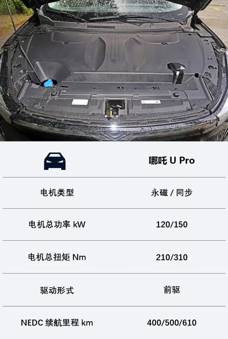 动力方面,哪吒U Pro搭载了一台前置的永磁同步电机。其中,400和500车型电机最大功率120kW,峰值扭矩210Nm,综合工况续航分别为400公里和500公里。顶配610版车型的最大功率均为150kW,峰值扭矩为310Nm,NEDC综合续航达到了同级领先的610公开,官方称其百公里加速时间仅7秒,同级中优势明显。