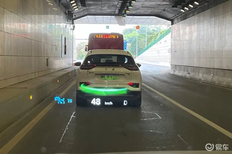 我这辆GS8有等效30英寸的AR-HUD抬头显示功能,上面能显示导航、跟车距离、当前的时速、限速信息等,打开自适应巡航功能以后,有绿色的光圈提示与前车的距离,而且车道偏离后也会有对应的提示,整体效果比较清晰,反应也很快,可以说是目前同价位车型中表现比较突出的车型。