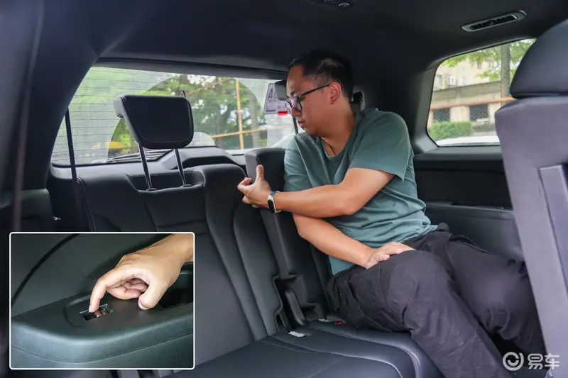 进出第三排空间同样很方面,靠右侧的座椅顶部有座椅一键放倒的按键,按下后座椅会自动前移并放倒。此时留出的过道是比较宽的,进出都不会特别费力。