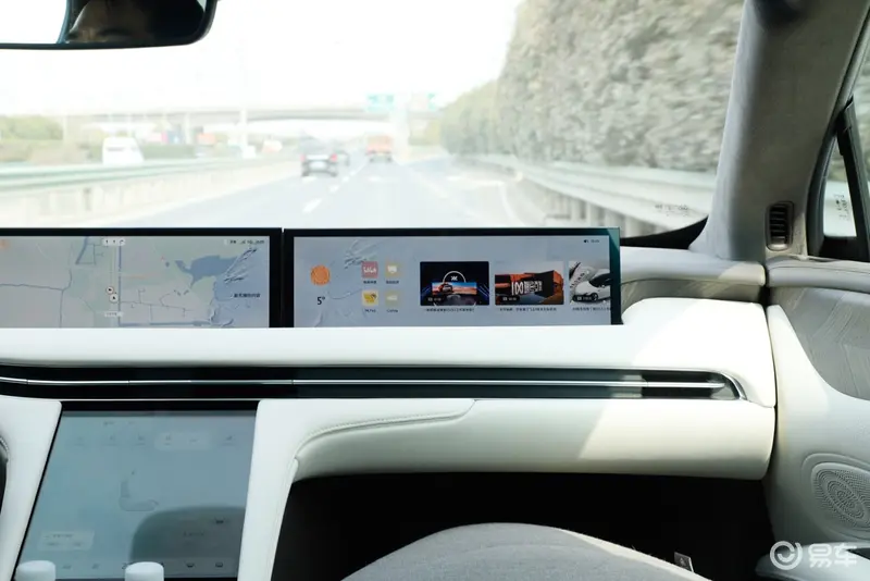 至于26.3英寸巨屏与15.5英寸副驾屏组成的超长升降双联屏,其实已经不新鲜了,我可以直接告诉你,升降功能不是必须的,而且行驶中只有副驾屏能上下滑动控制升降,噱头大于实用性。