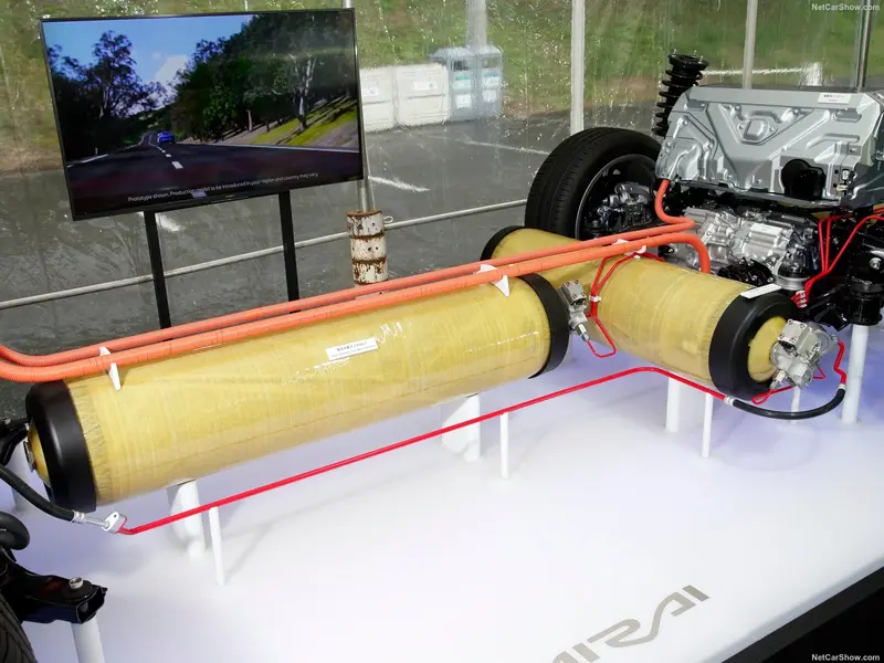 第二代Mirai的储氢罐由三层结构打造而成,从里到外分别是树脂、碳纤维、玻璃纤维,数量由第一代的2个增加至3个。氢气罐以“T”形布置,最长的纵向氢气罐安装在车辆地板下方,两个较小的氢气罐横向布置在后排座椅和行李厢下方。灌装压力为 70兆帕高压,总量可储存5.6公斤氢气燃料,相较于上一代氢气搭载量提升约20%,能耗降低约10%,理想状态下可行驶781km。