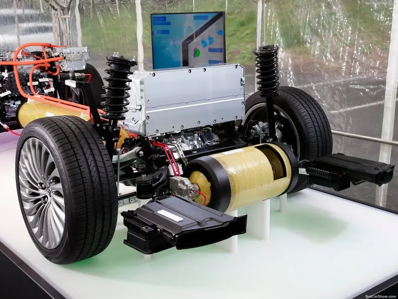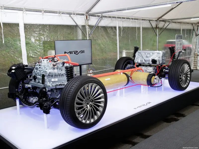 第二代Mirai采用与雷克萨斯LS相同的TNGA-GL平台打造,动力为前置后驱(FR)布局。与第一代相比,整体长度和宽度增加,车身高度更低,保持TNGA架构宽车身、低重心风格。同时通过优化细节布局,整车实现50:50前后重量分配。