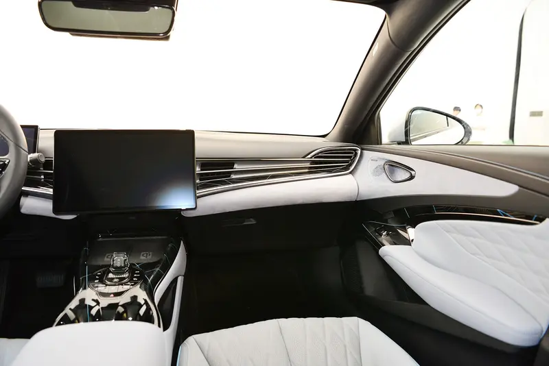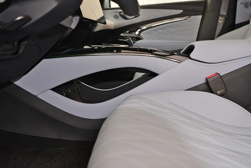 海豹车内采用了多种内饰材质,包括中控台用了深色的人造皮革、浅色的翻毛皮,还有座椅和车门板上都用上真皮包覆,再加上亮光的黑色塑料件,并用浅蓝色线条加以点缀。