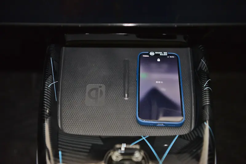 悬浮式中控台下方设有一个储物格,方便放置钱包等日常随身物品,底下设有USB、type-C接口以及12V电源接口。