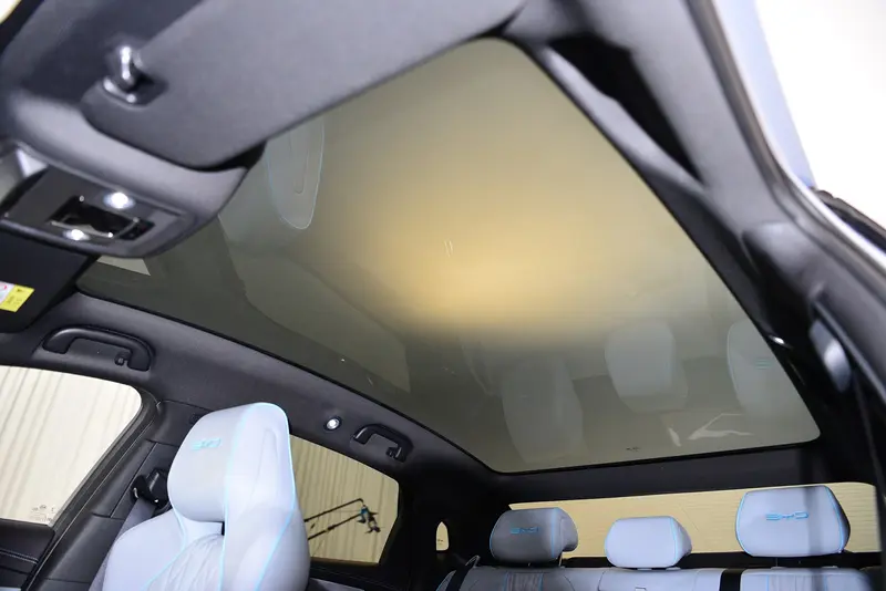 最后值得一提的是海豹的全景天幕,面积很大,从前排头顶一直延伸到后排头枕上方。夏天马上就到了,到时候新车试驾再来体验这块天幕的挡热效果。