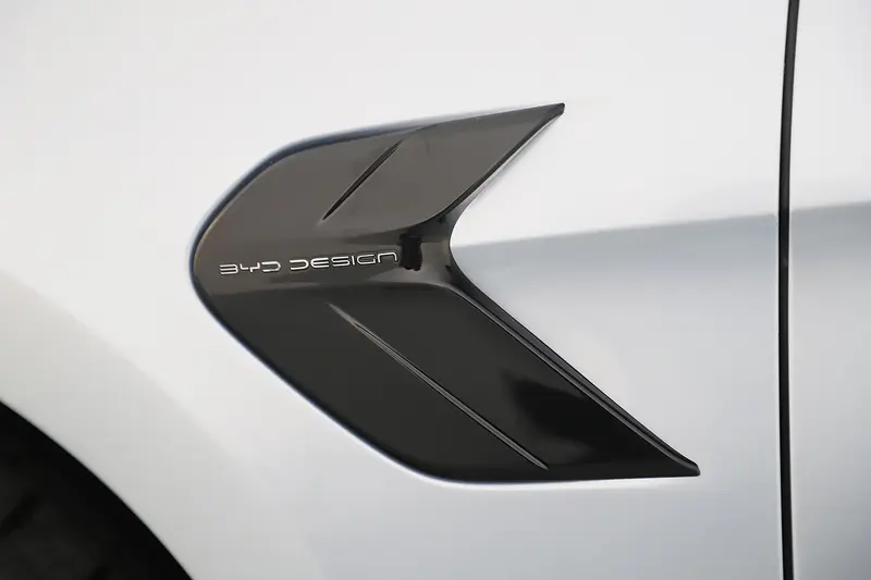 在海豹的前翼子板位置,还带有类似于“鱼鳍”的装饰件,上面写有“BYD DESIGN”。