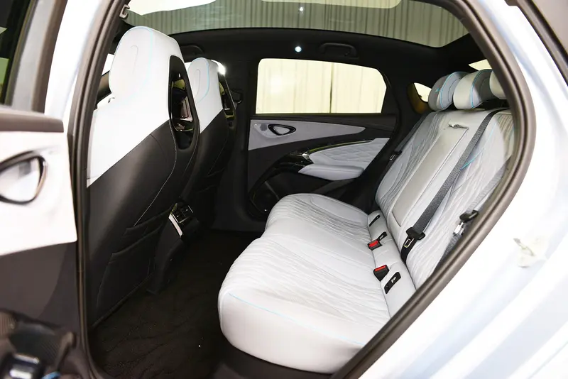 海豹前排座椅是采用了真皮包裹的一体式运动座椅的设计,主副驾驶位均为电动调节,还加入了菱形格纹以及打孔处理。坐垫柔软度是不错的,座椅两侧还提供良好的包裹性,所以新车座椅乘坐舒适性值得一赞。