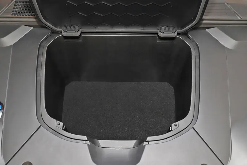 海豹在前舱设有一个带盖板的储物格,实测长度有365mm,最大宽度560mm,纵深130-290mm,放下一箱矿泉水不成问题。