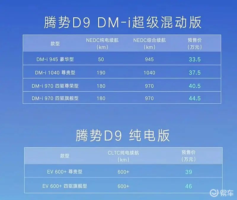 腾势D9已正式发布并开启预售,其中DM-i插电式混合动力版本推出4款车型,预售价33.5-44.5万元,EV纯电版本推出两款车型,预售价39-46万元,与此同时推出99台创始版车型,售价66万元。