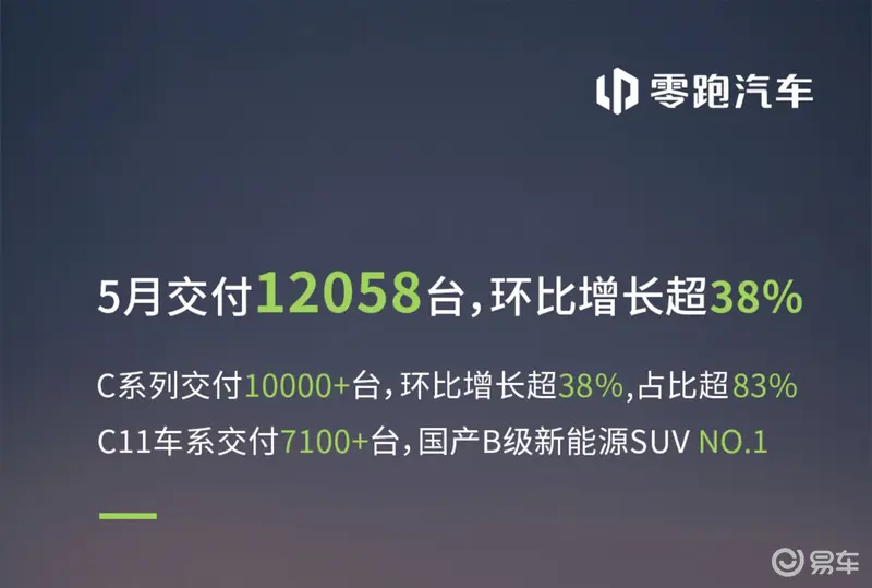 易车讯 6月1日,零跑汽车对外公布5月份最新交付数据,当月共计交付新车12058台,环比增长38%。其中,C系列交付破万台,环比增长超38%,占比超83%。C11车系交付超7100台,双创历史新高。