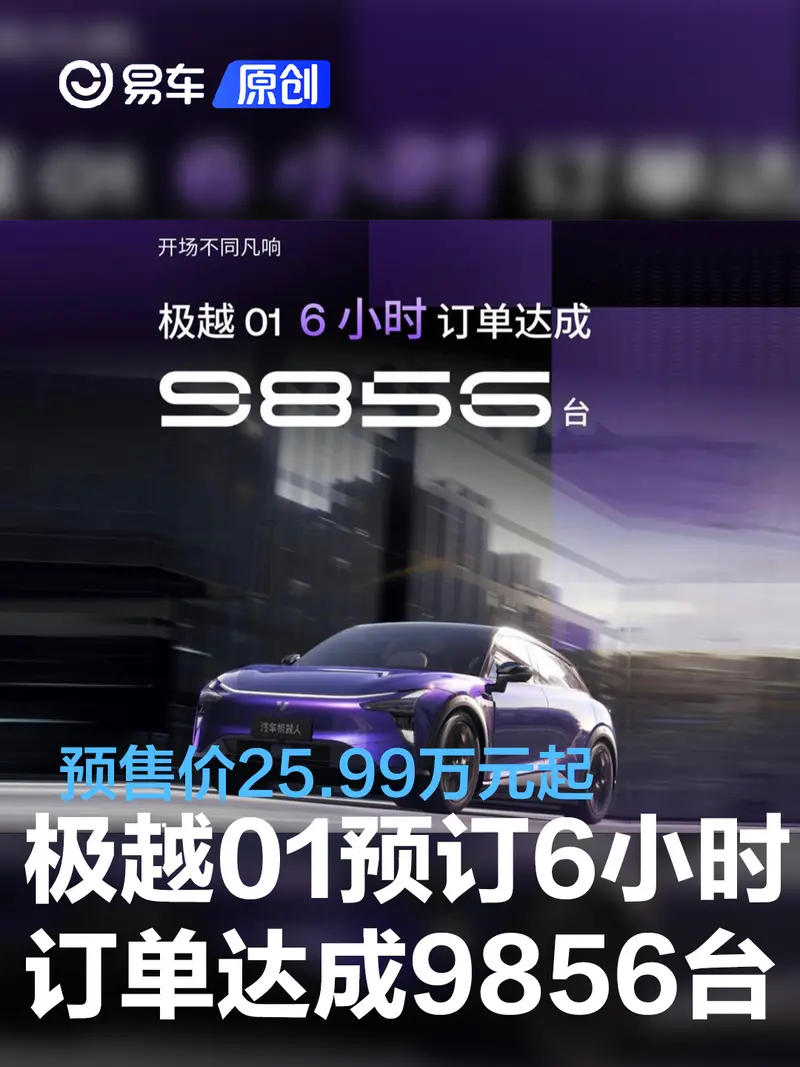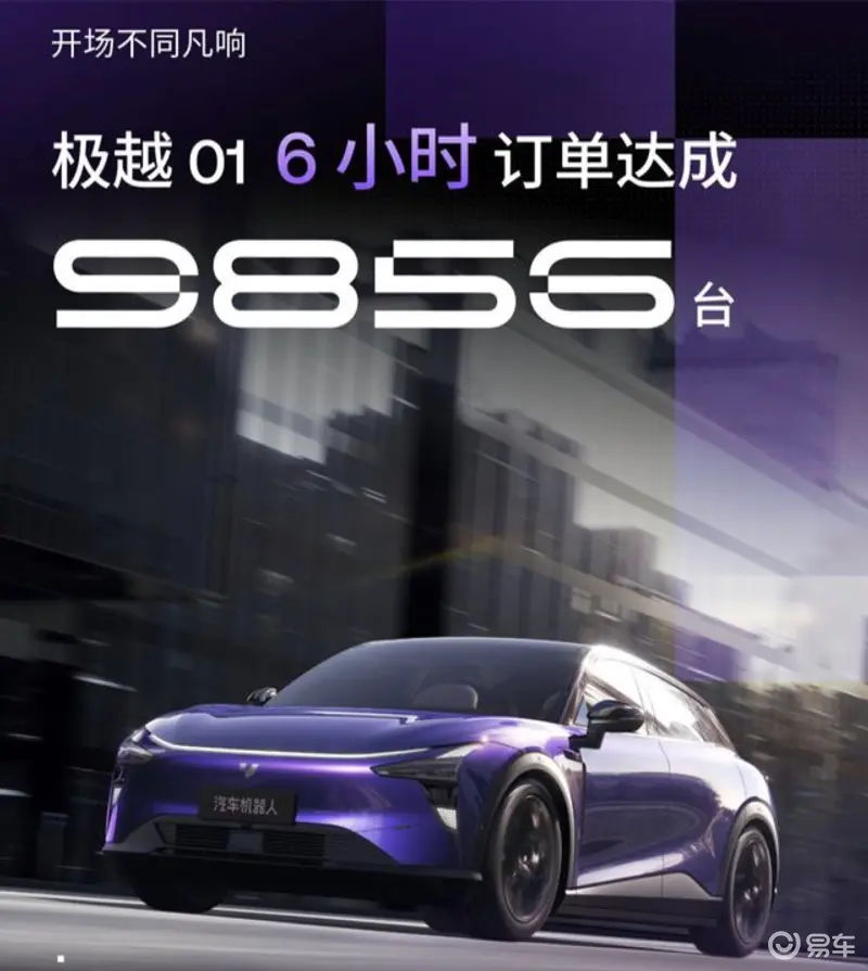 易车讯 我们从官方获悉,极越01预订6小时订单达成9856台。新车基于SEA浩瀚架构打造,定位纯电中型SUV。据悉,目前极越01已进入批量生产阶段,将于10月上市。