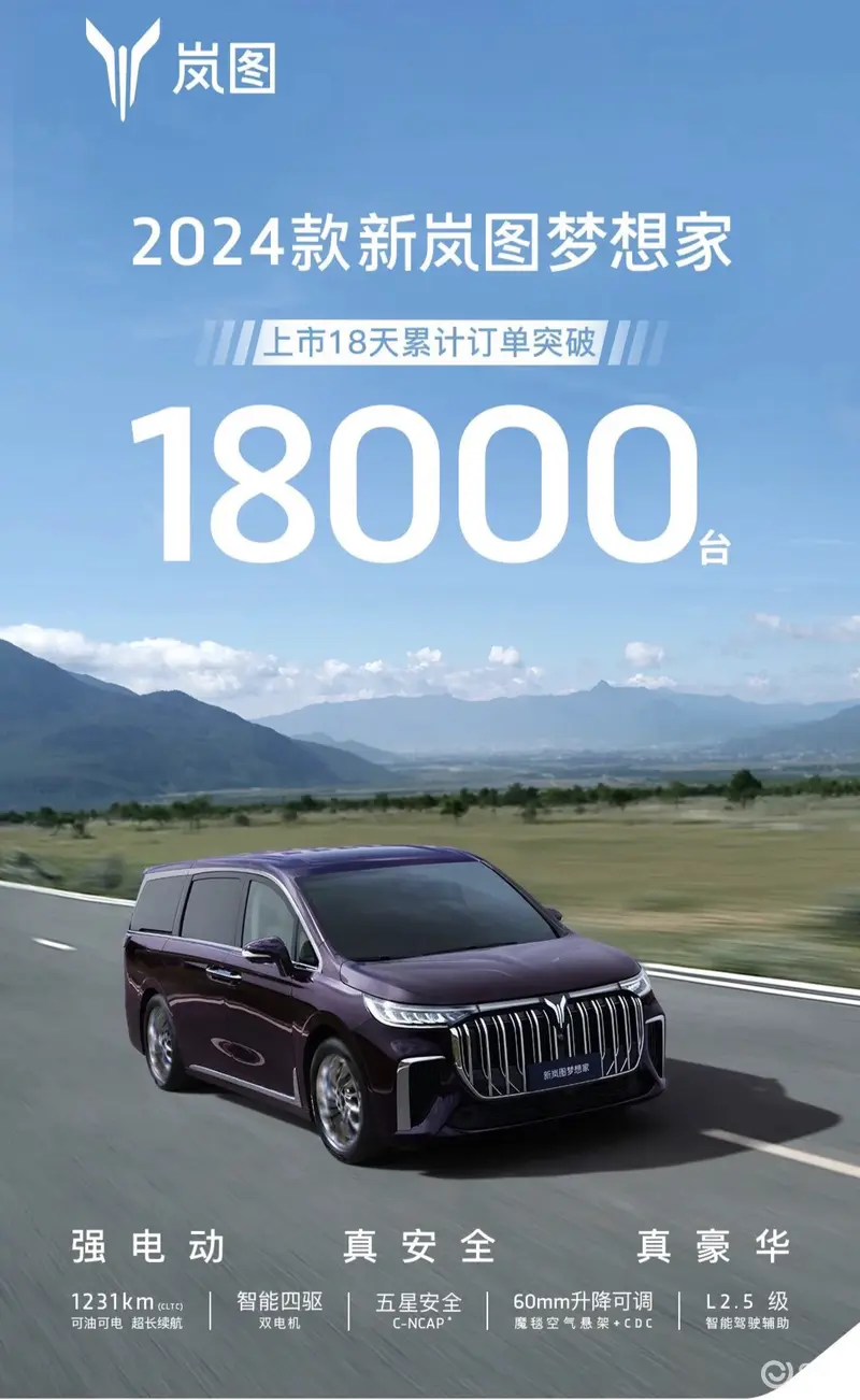 易车讯 我们从官方获悉,新岚图梦想家上市18天累计订单突破18000台。新车售价区间为33.99-46.99万元。新车新增了前排座椅按摩功能、二排座椅电动滑轨等9项功能,此外在续航、能耗、内饰豪华感、手机充电功率等方面也将进行升级,竞争力得到大幅提升。