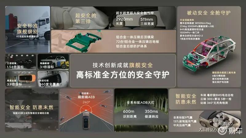 乐道L60拥有同级最优的座舱可用空间效率,头等舱式的座椅宽肩设计,提供完美的舒适坐姿和体感。二排右侧尊享零重力座椅,超大空间无需横移,一键进入零重力姿态。坐垫与靠背压力平均分布,带来极致的休憩享受。乐道L90作为一款纯电大型SUV,是轻量化水平最高的大三排SUV,白车身质量433.8kg,整车质量仅为2250kg。