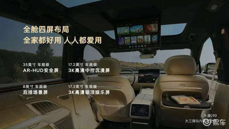 乐道L90还配备了17.3英寸3K吸顶娱乐屏,屏占比高达91.5%,以及8英寸后排场景屏,并配备35英寸AR-HUD安全屏全景智能抬头显示系统。