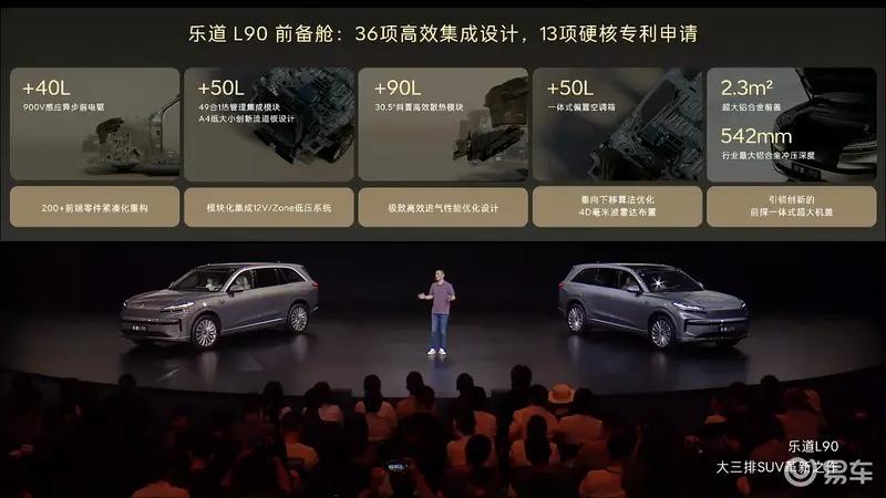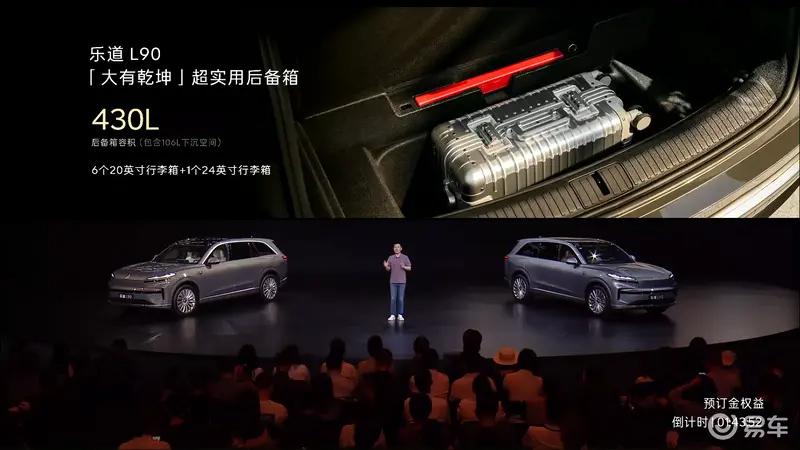 车尾方面,新车继续沿用了家族式设计语言,尾灯采用横条设计,同时也支持智能交互功能,还配备有车顶扰流板以及隐藏式后雨刷。此外,尾部左下角L90标识的下方还有一个小标记,有橙色杠的为四驱性能版,没有的话为两驱版。后备厢的装载能力也非常出色,拥有430L(含106L隐藏空间)的储物空间。