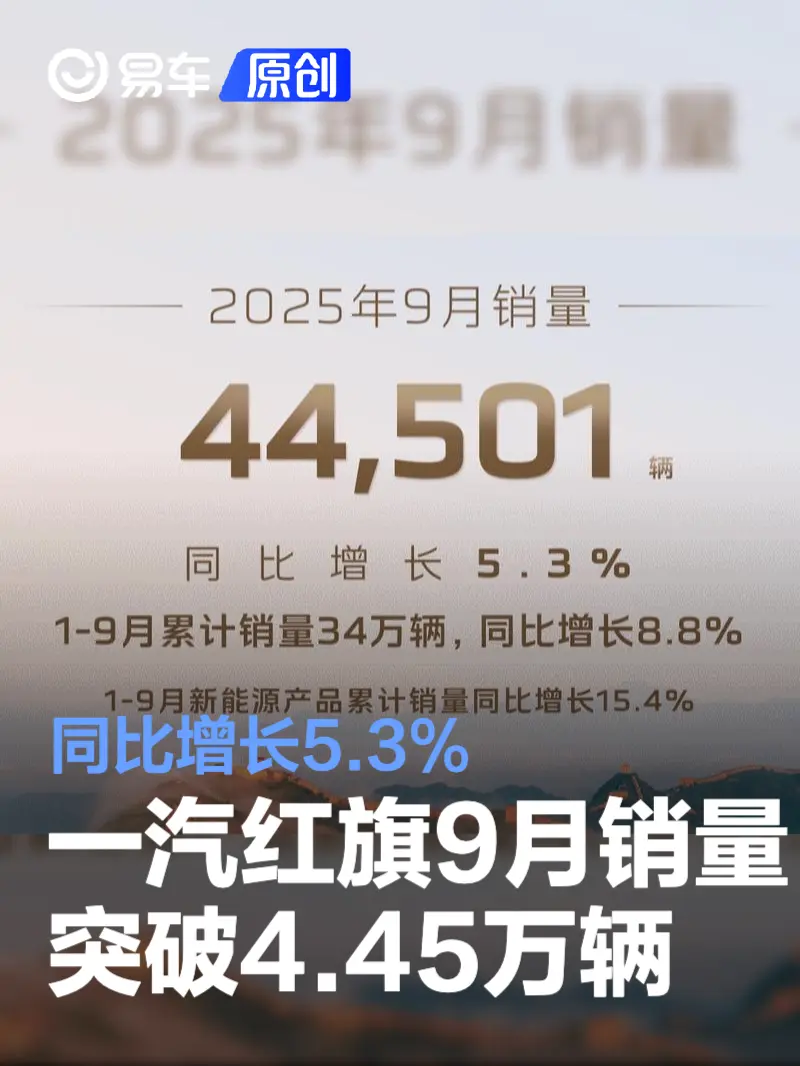 一汽红旗9月销量突破4.45万辆 同比增长5.3% 2025-10-02 17:09 来源:汽车产经网 作者:易车原创报道 举报 易车讯 日前,一汽红旗公布最新销量数据。2025年9月,红旗品牌单月销量突破4.45万辆,同比增长5.3%,1-9月累计销量34万辆,同比增长8.8%。 其中,红旗新能源产品1-9月累计销量同比增长15.4%。红旗金葵花产品1-9月累计销量同比增长28.3%。