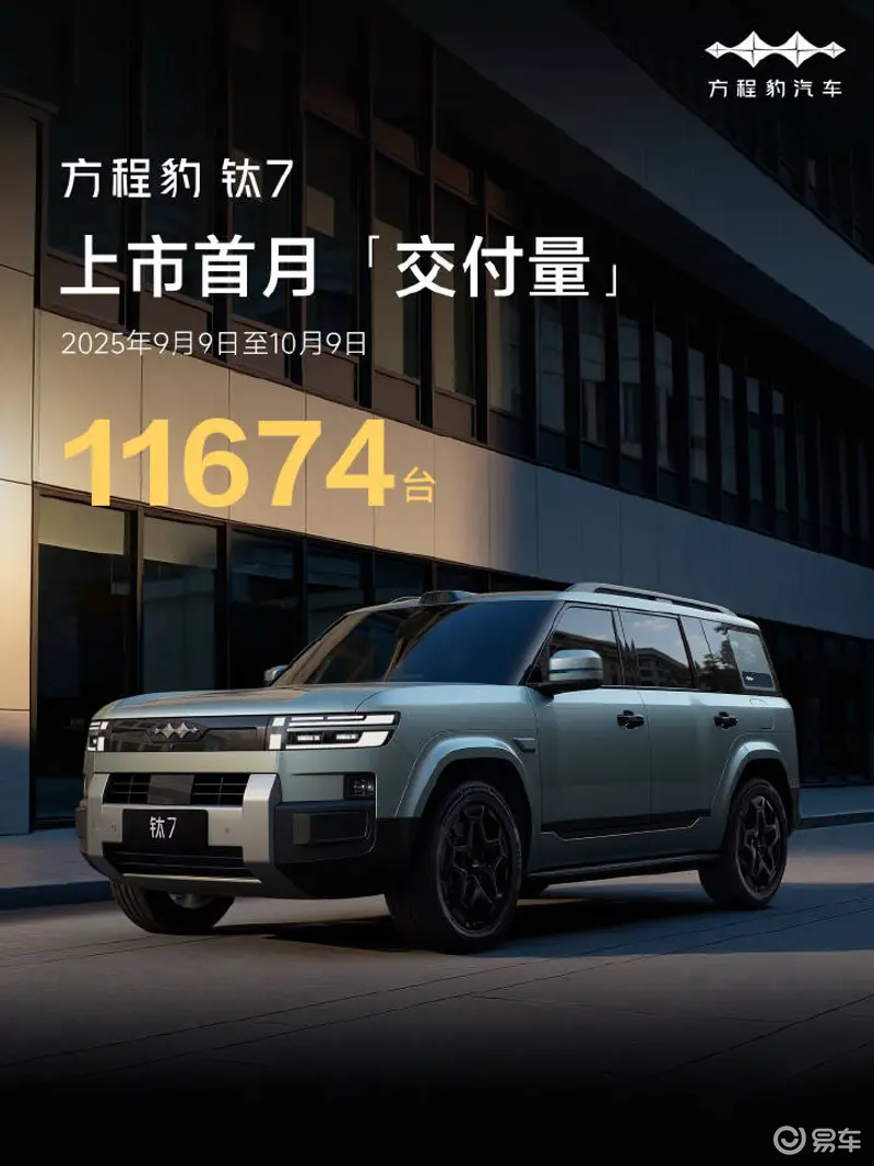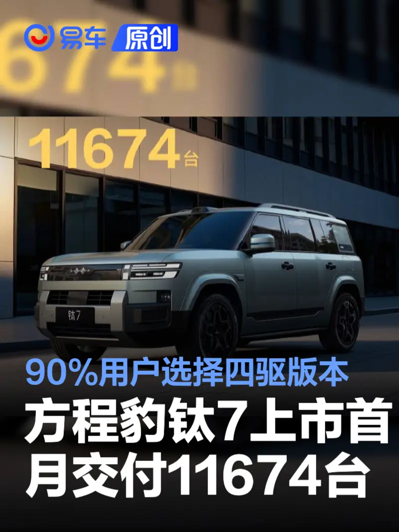 易车讯 10月11日,方程豹汽车宣布,方程豹钛7上市首月交付11674台,其中90%的用户选择四驱版本,而在颜色方面,曜石黑则最受用户青睐。