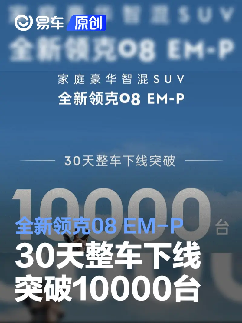 易车讯 10月23日,领克汽车官方宣布全新领克08 EM-P 30天整车下线突破10000台,迎来里程碑时刻。新车于9月24日上市,共推出4款配置,官方售价17.58-22.88万元。