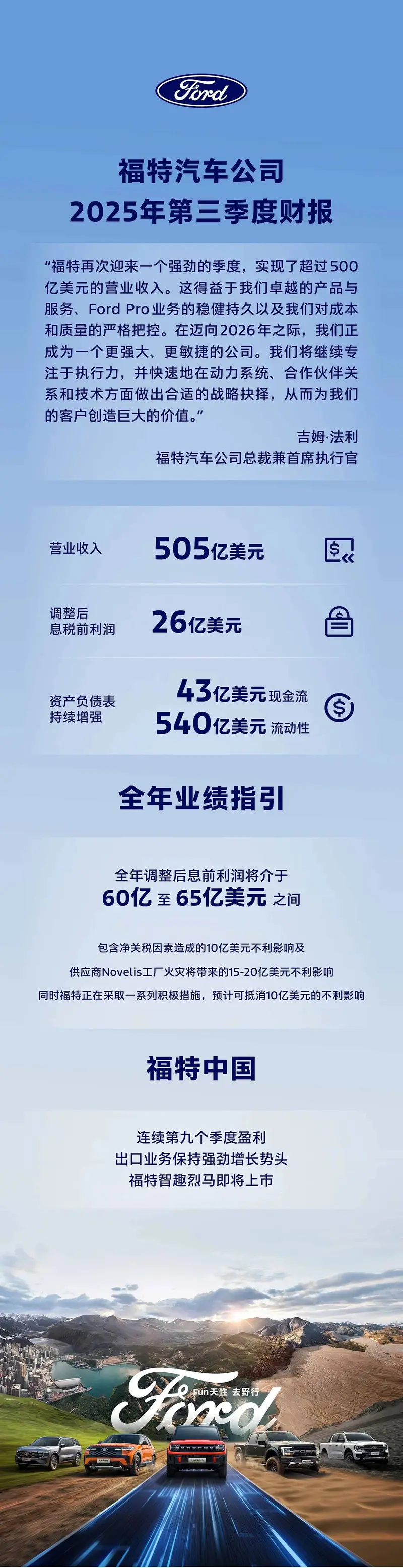 易车讯 10月24日,福特汽车发布2025年第三季度财报,当季营收505亿美元,创历史新高,全年业绩指引更新。福特中国实现了连续九个季度盈利,出口业务保持强劲增长势头。