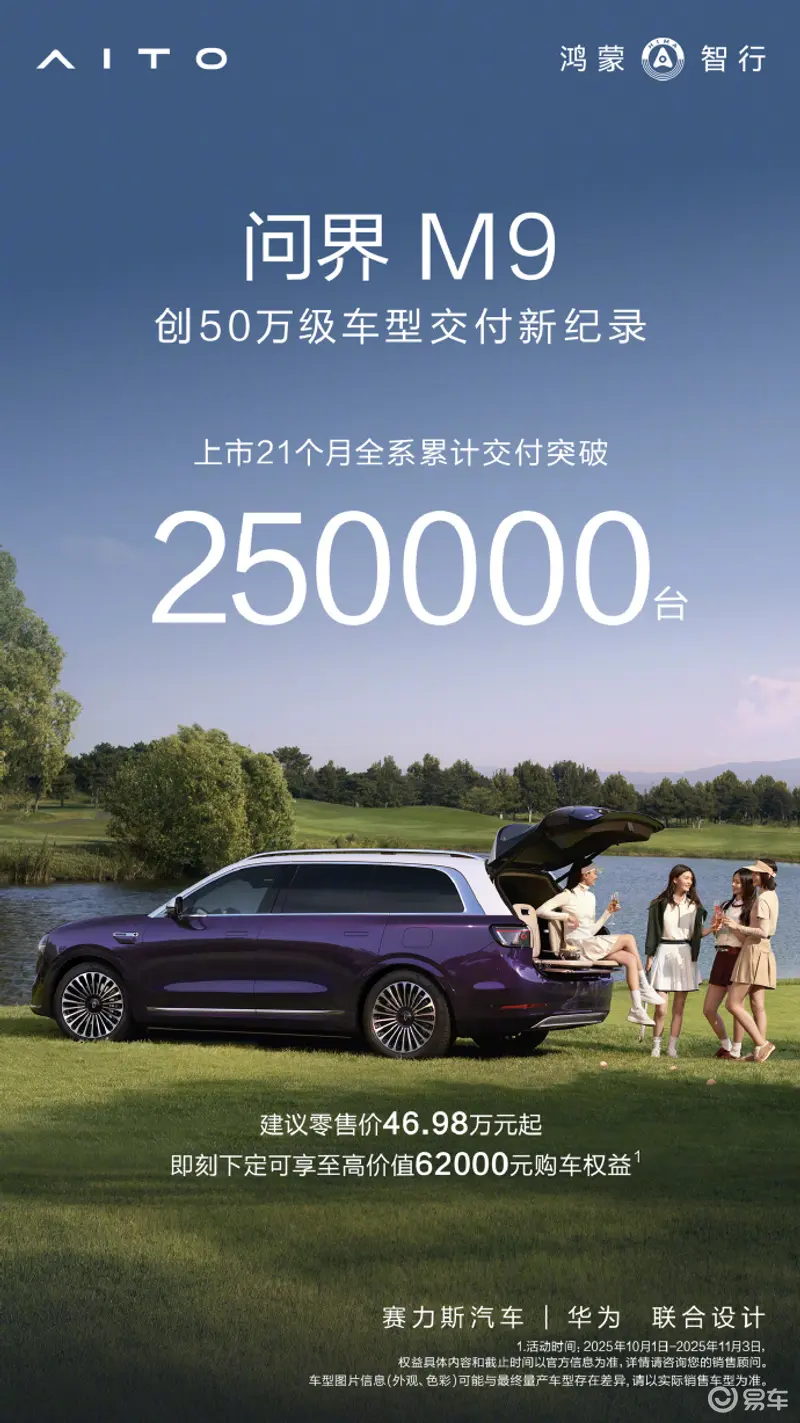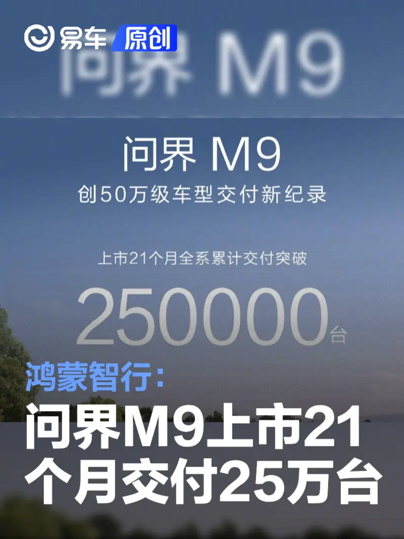 易车讯 10月28日,鸿蒙智行今日宣布,问界M9上市21个月全系累计交付突破250000台,创50万级车型交付新纪录。