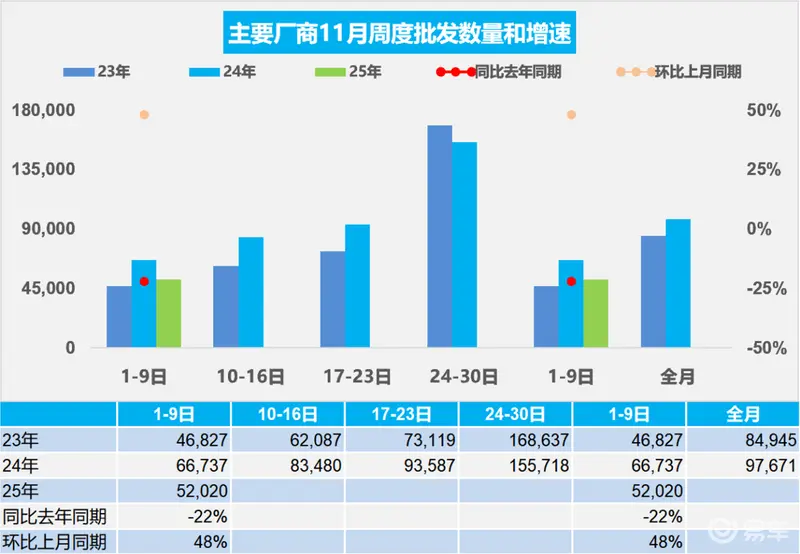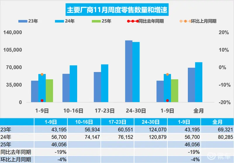 2025年11月开局车市零售走势不强,由于去年11月市场持续拉升火爆,今年零售增速偏低,但相对于2023年同期销量仍是7%的小幅增长。10月车市零售是逐周降温,因此11月初的零售环比10月的增长也是偏弱的。