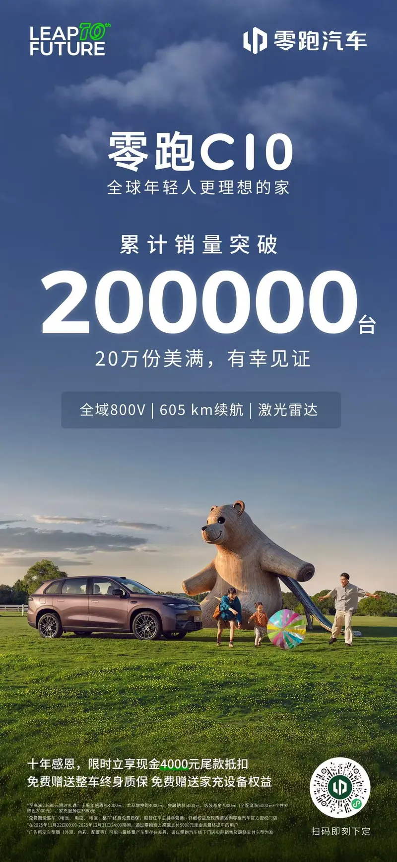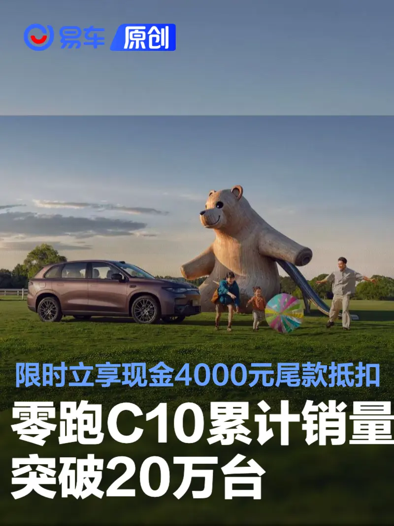 易车讯 11月24日,零跑汽车宣布C10累计销量破20万台。十年感恩,限时立享现金4000元尾款抵扣、免费赠送整车终身质保以及免费赠送家充设备权益。