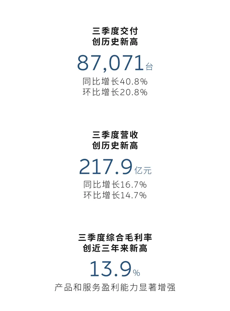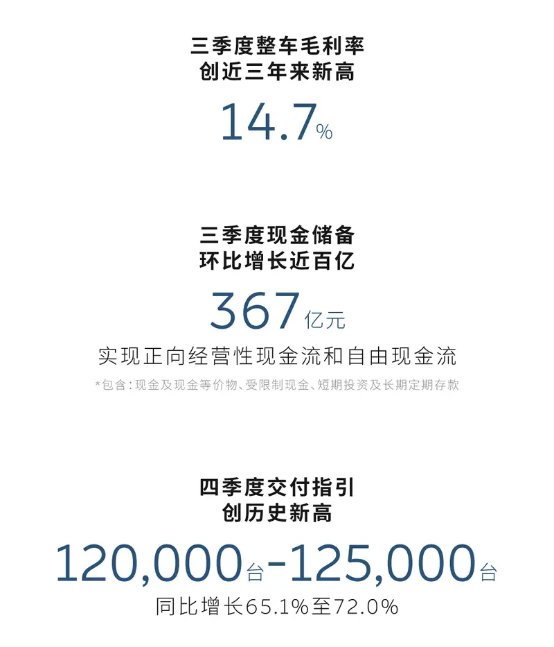 三季度营收217.9亿元,同比增长16.7%,环比增长14.7%,创历史新高。三季度综合毛利率13.9%,创近三年来新高,产品和服务盈利能力显著增强。三季度整车毛利率14.7%,创近三年新高。三季度现金储备367亿元,环比大幅增长近百亿,实现正向经营性现金流和自由现金流。四季度交付指引120,000台至125,000台,同比增长65.1%至72.0%,创历史新高。营收指引327.6亿元至340.4亿元,同比增长66.3%至72.8%,创历史新高。