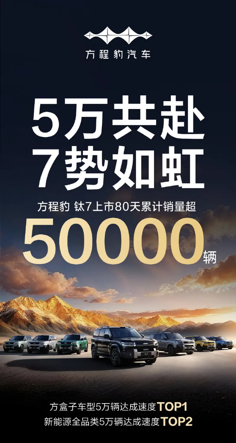 易车讯 11月27日,方程豹汽车宣布,方程豹 钛7上市80天累计销量超5万辆,打破了方盒子实现5万销量速度的历史记录。