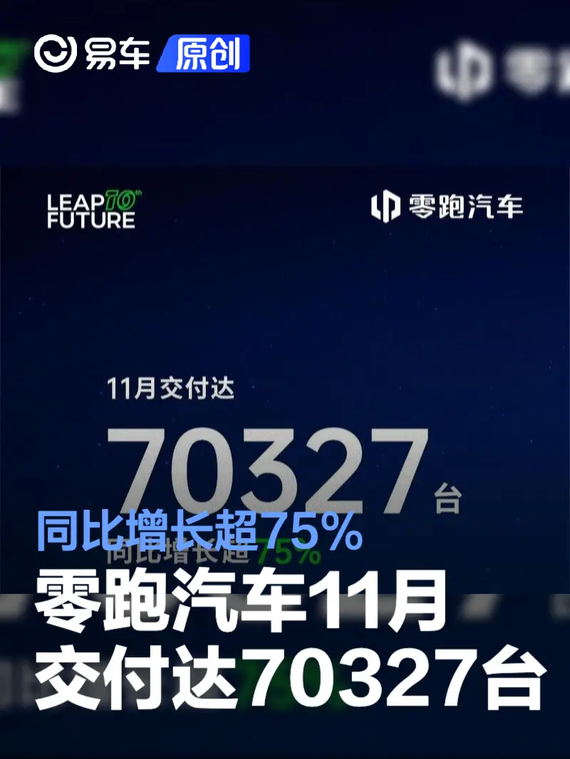 易车讯 12月1日,零跑汽车公布最新交付数据。2025年11月,零跑全系交付再创新高达70327台,同比增长超75%,持续刷新月销纪录,并已连续九个月保持强劲增长态势。