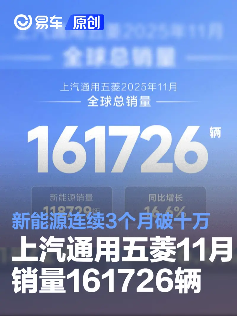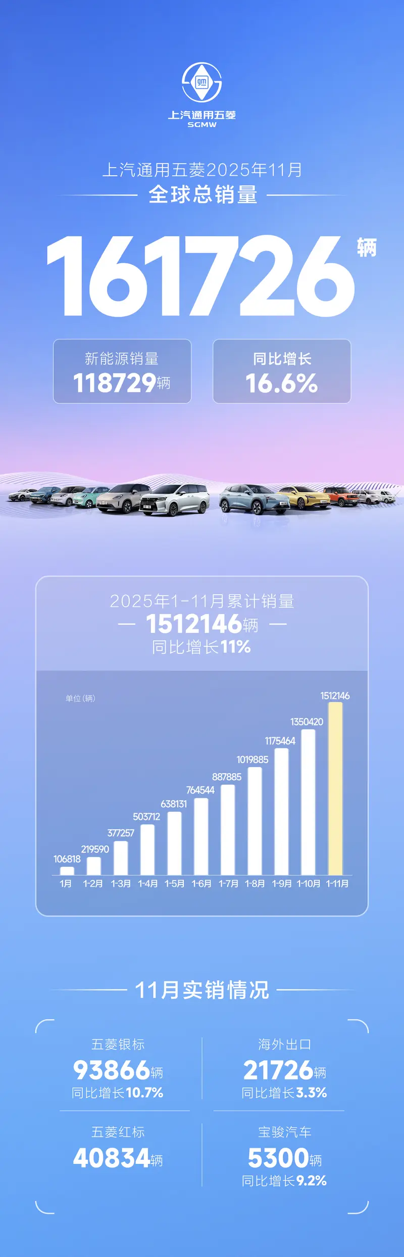 易车讯 12月1日,上汽通用五菱官方宣布,11月全球销量161726辆,其中新能源销量118729辆,同比增长16.6%。2025年1-11月累计销量达到1512146辆,同比增长11%。