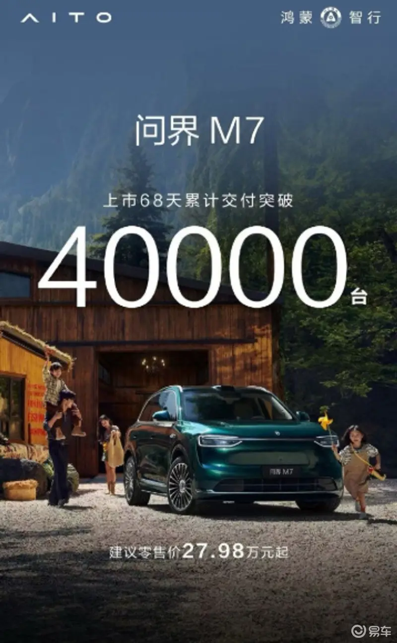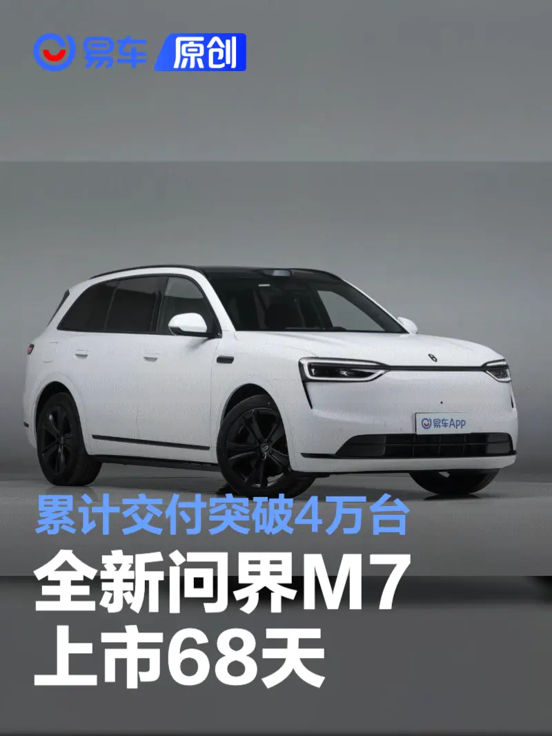 易车讯 12月2日,鸿蒙智行公布全新问界M7最新销量数据,上市68天累计交付突破40000台。全新问界M7于9月23日上市,售价区间27.98-37.98万元。新车搭载华为ADS 4智能驾驶辅助系统,首搭舱内激光视觉方案。