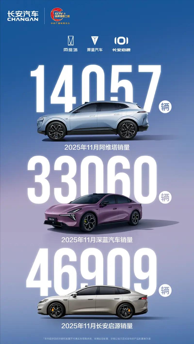 具体来看,2025年11月,阿维塔品牌销量14057辆,深蓝汽车销量33060辆,长安启源销量46909辆。