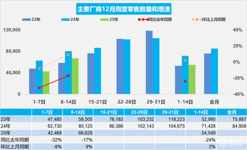 12月第二周全国乘用车市场日均零售6.7万辆,同比去年12月同期下降17%,较上月同期增长9%。