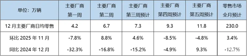 11月底厂商集中冲量,致使12月初车市热度回落,第一周日均零售4.2万辆,同比下降32.3%,环比下降7.8%。第二周厂商借力 “双十二”促销,日均零售6.7万辆,同比下降16.8%,环比增长8.8%,市场有所回暖。第三周虽限时促销结束,但前期订单持续交付,预计日均零售可达7.3万辆。进入下旬,消费者观望情绪浓厚,市场增长动力减弱,第四周预计日均零售9.3万辆。第五周厂商进入年度目标冲刺阶段,日均零售预计攀升至11.8万辆(受去年同期低基数影响,同比增长9.3%,环比下降4.8%)。综合全月,预计零售市场230万,环比增长3.4%,同比下降12.7%。