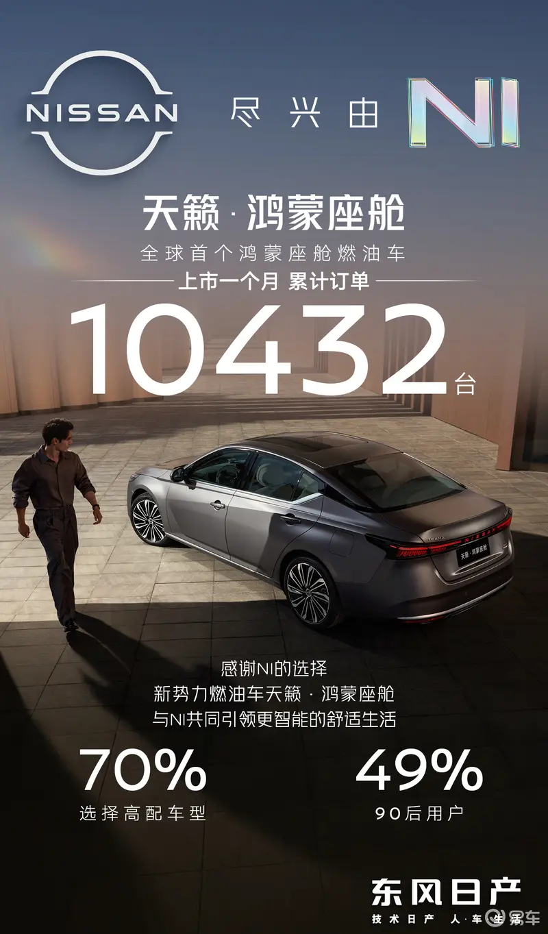 易车讯 东风日产日前宣布,天籁·鸿蒙座舱车型上市首月订单突破1万台(10432台),其中49%为90后用户,70%选择了高配车型。天籁·鸿蒙座舱于今年广州车展上市,推出四款车型,官方指导价区间13.99-16.79万元,限时售价区间12.99-15.79万元。