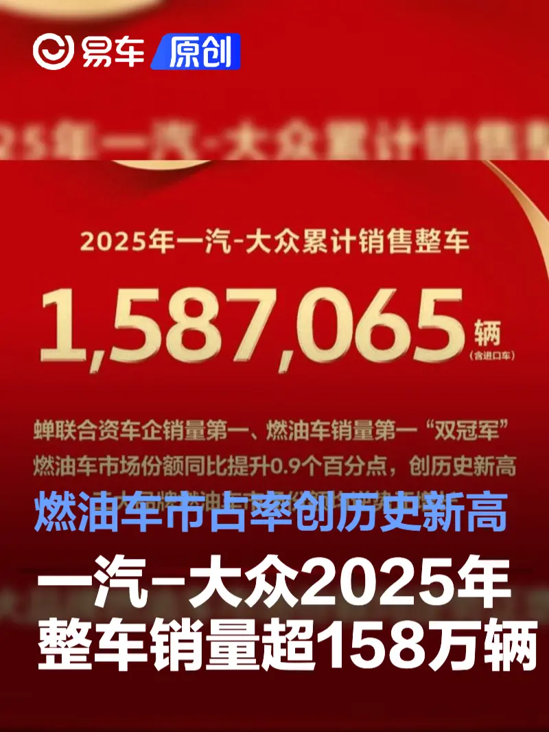 易车讯 1月1日,一汽-大众正式发布2025年度业绩。2025年,一汽-大众全年整车销量1,587,065辆(含进口车),其中大众品牌902,066辆,奥迪品牌566,988辆(含进口车),捷达品牌118,011辆,再次蝉联合资车企销量第一、燃油车销量第一“双冠军”。