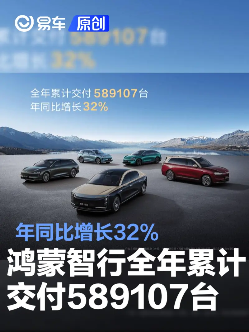 鸿蒙智行全年累计交付589107台 年同比增长32% 2026-01-01 09:44 来源:汽车产经网 作者:易车原创报道 举报 易车讯 2026年1月1日,鸿蒙智行公布最新销量数据。2025年,鸿蒙智行全年累计交付589107台,年同比增长32%;12月单月交付89611台,连续三个月创月度交付历史新高。 此前,在《超凡一步 | 在一起 鸿蒙智行》直播活动中公布了鸿蒙智行2026年新车规划。其中,享界将会推出SUV和MPV车型,尚界将在2026年推出至少2款新车,智界V9将于2026年春季上市,问界产品则会迎来全面迭代。